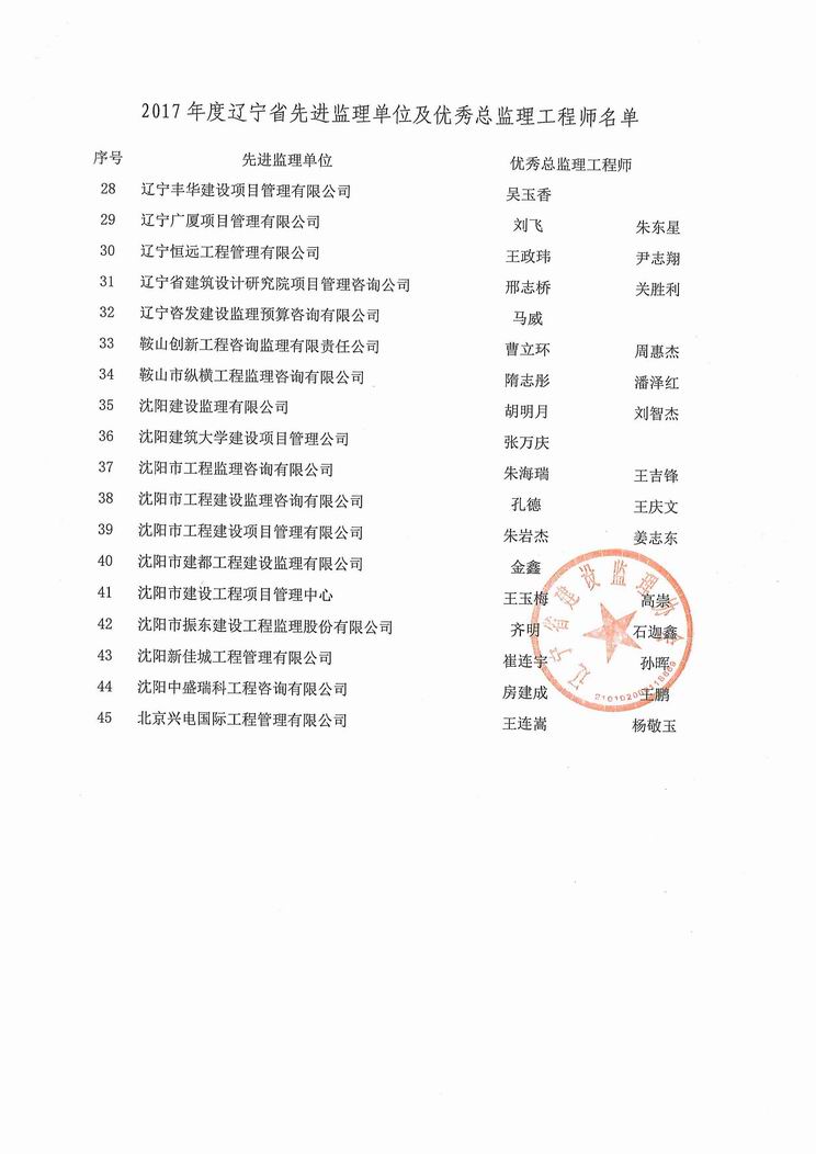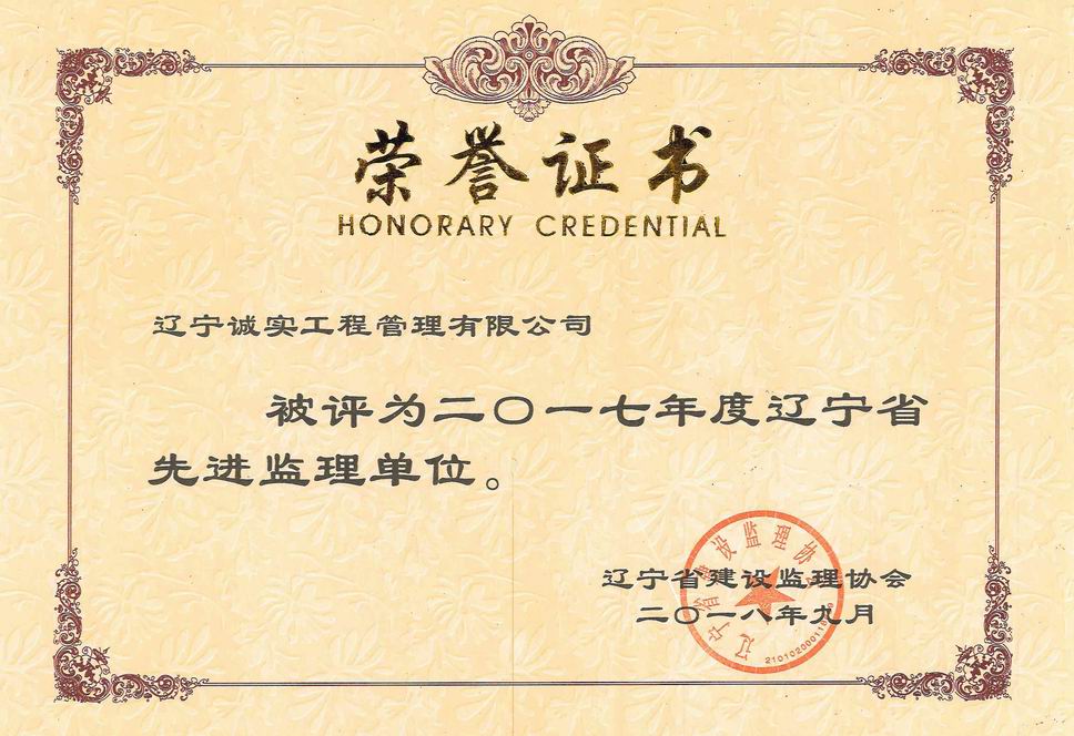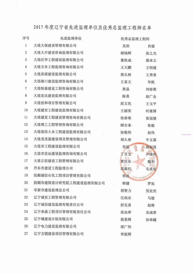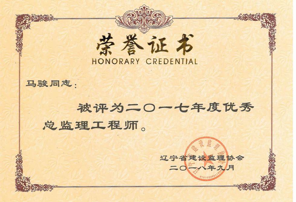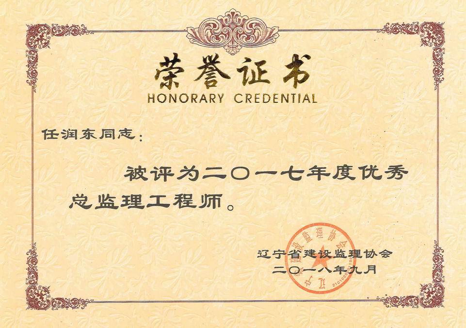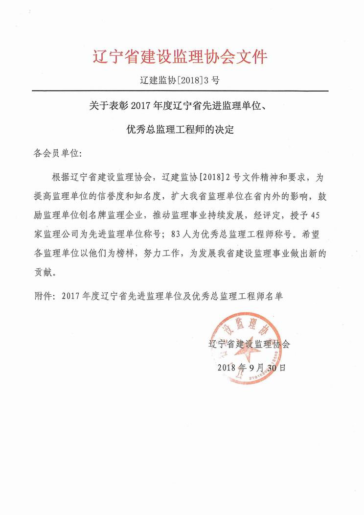 我公司被遼寧省建設(shè)監(jiān)理協(xié)會評為2017年度遼寧省先進(jìn)監(jiān)理單位、任潤東和馬駿被評為優(yōu)秀總監(jiān)理工程師