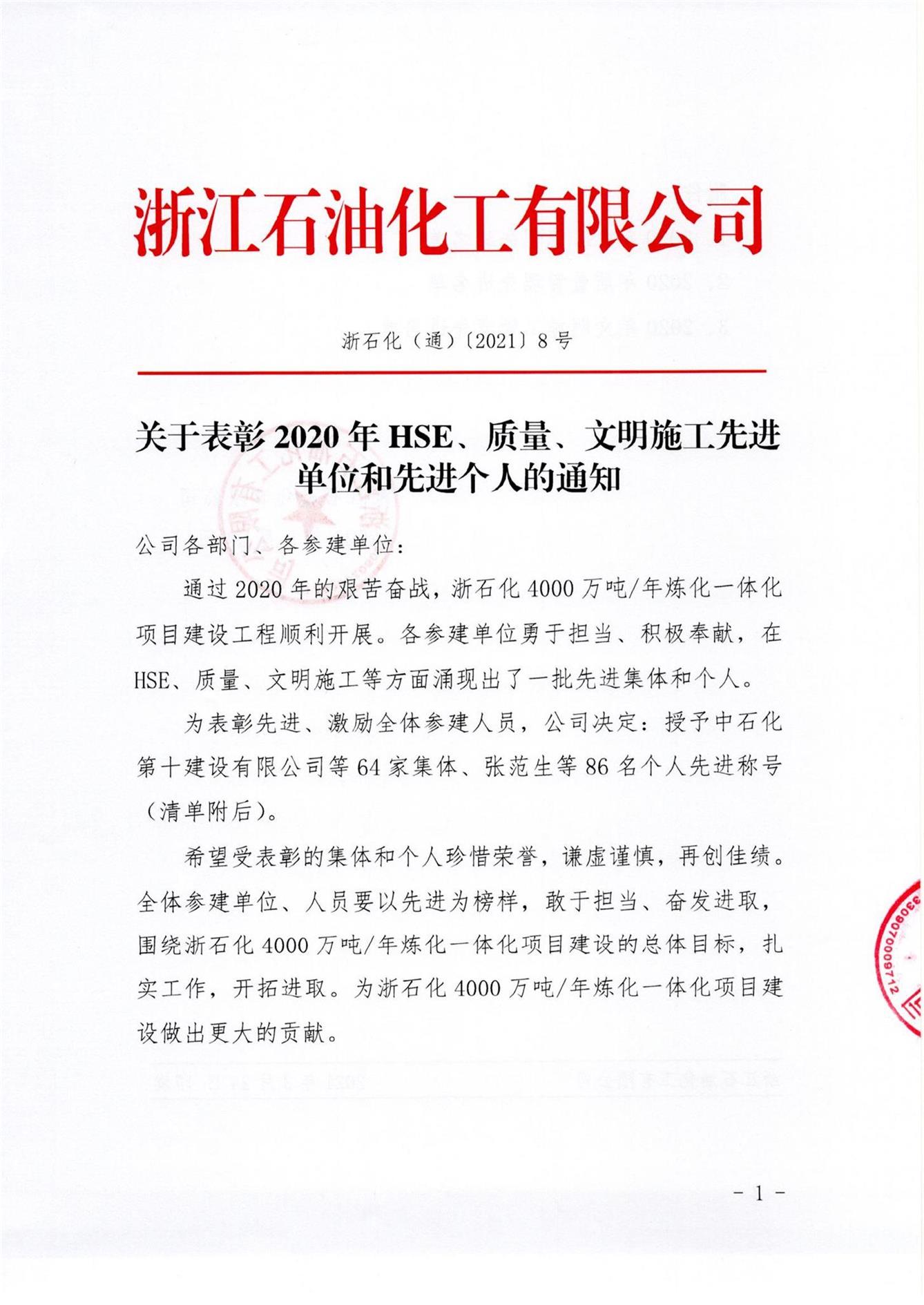 熱烈祝賀沈志強同志榮獲浙江石油化工有限公司4000萬噸/年煉化一體化項目“質(zhì)量管理先進個人”榮譽稱號